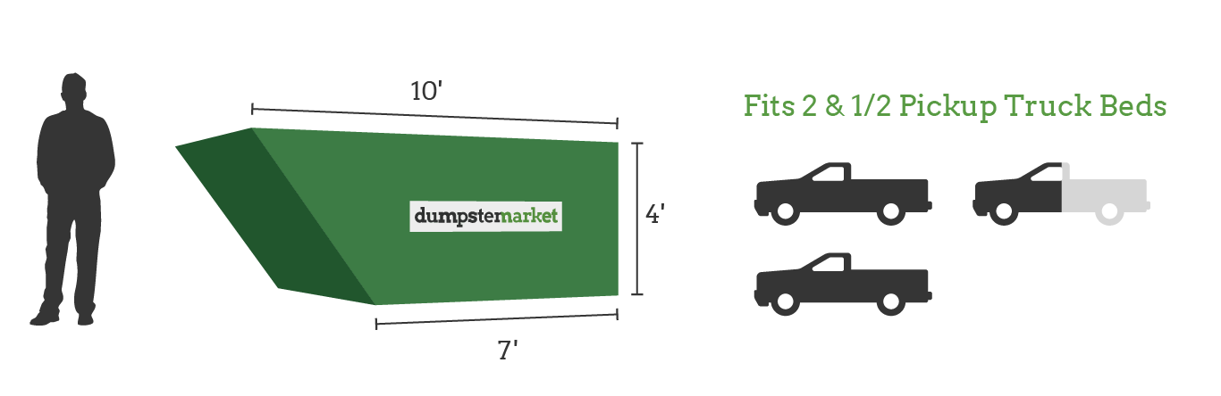 What size dumpster is right for your project? It depends on a combination of the size of the project you are working on and the footprint you have available to place the dumpster. We’ve broken down each roll-off dumpster size by dimensions, common uses, and their capacity equivalent in full-size pickup trucks to help you decide which one is right for you. A 6 yard dumpster is one of the smallest roll off sizes offered.